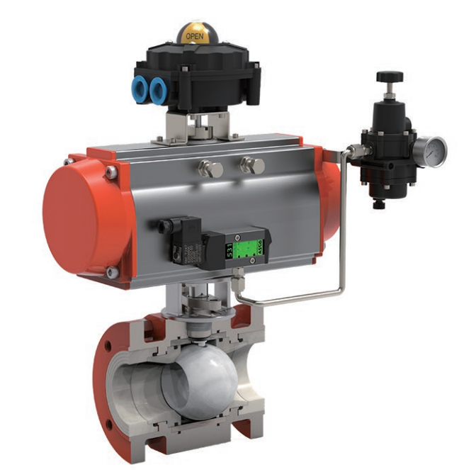 氣動耐磨陶瓷球閥V型球閥閥芯設(shè)計成帶有特殊開關(guān)的V型缺口,流通能力大,壓力損失小,并具有精確的截流特性和控制功能,流量特性為近似等百分比。啟閉件采用V型球缺結(jié)構(gòu),完全解決了閥腔易沉積介質(zhì)的